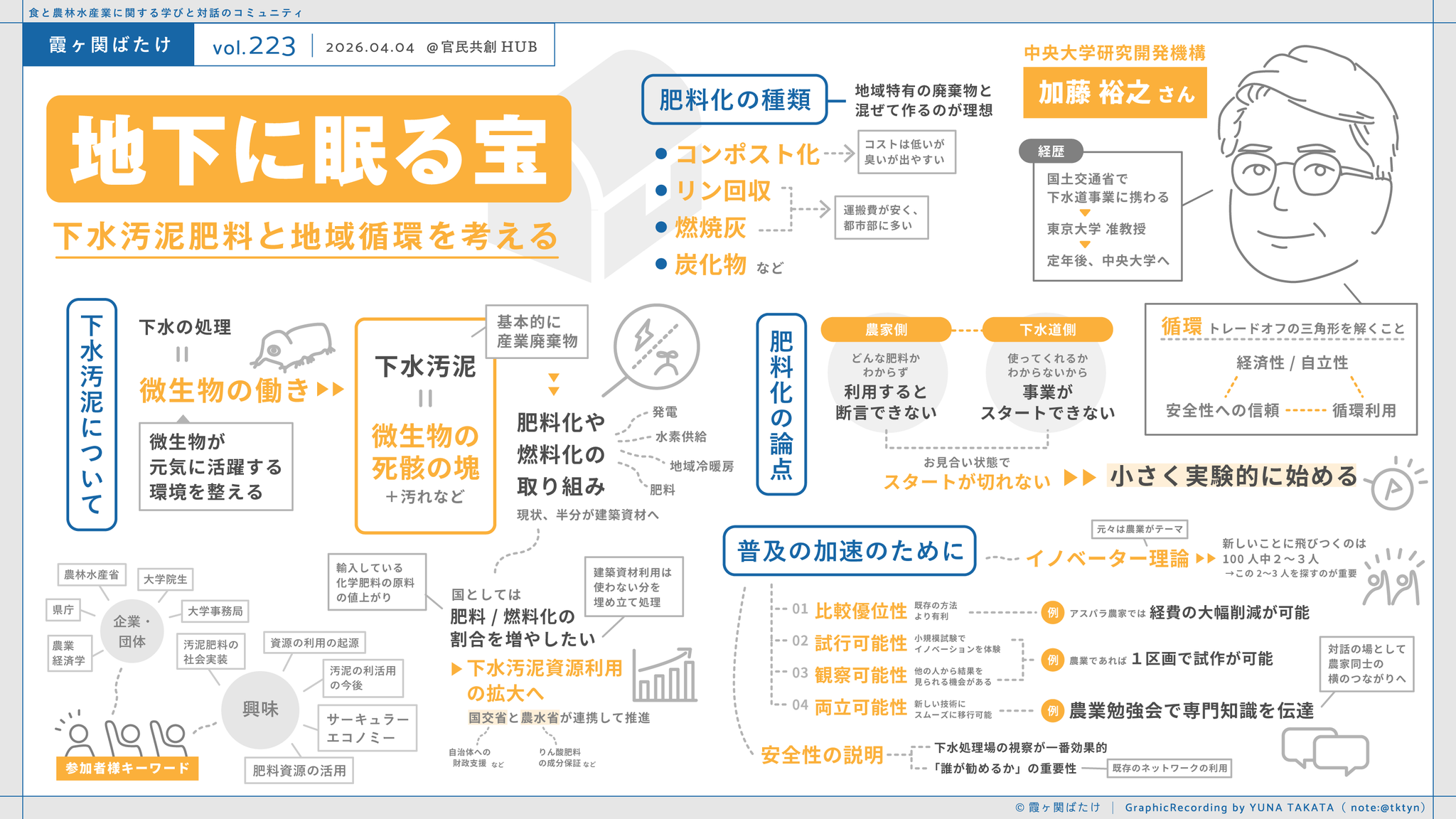 大量生産、大量消費社会において、廃棄後の循環がキーポイントとなっていると感じます。 加藤先生のお話を伺い、下水インフラが整備され、廃棄後の資源が集約する仕組みが既にある日本では、下水のフル活用が非常に有効だと感じました。 特に興味深かったのが、ロジャースの普及理論は農業が原点であり、下水汚泥肥料においても当てはめることができるということ。 何事も、まずは小さく試行し、仲間を増やしていく事が近道だと感じました。 「眠る宝」が多くの人に認められ、人々の笑顔を増やす「循環する宝」になると良いなと思います。 (徳田)